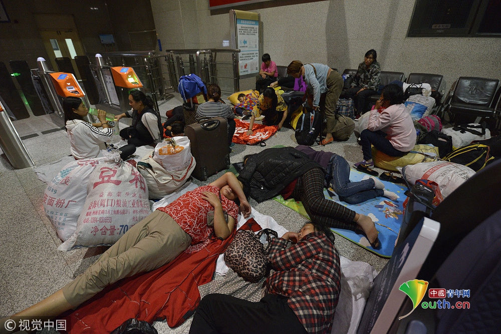 2018年9月15日,在鄭州火車(chē)站候車(chē)大廳,來(lái)自周口西華縣農(nóng)村的數(shù)百名采棉工,為趕早上4點(diǎn)50分的火車(chē),在火車(chē)室打地鋪休息。