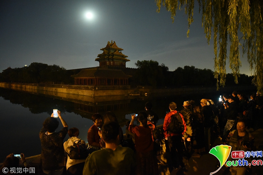 市民和攝影愛好者聚集故宮角樓下拍攝月亮。