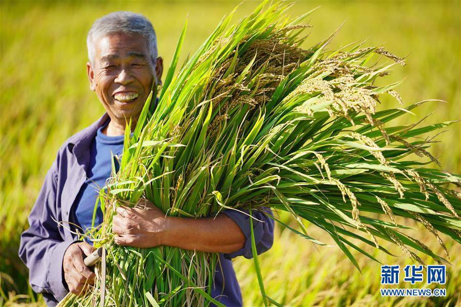 9月23日,河北省灤縣茨榆坨鎮(zhèn)西長坨村農(nóng)民金玉柱在收獲稻米。