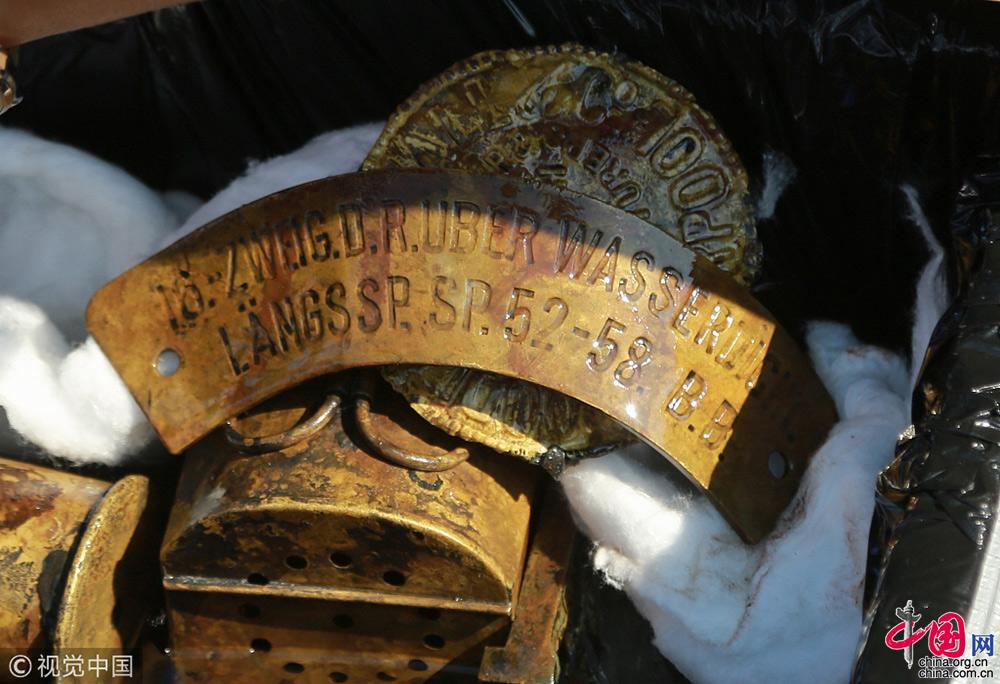 2018年9月25日,遼寧大連,在莊河黑島海域甲午戰(zhàn)爭“經(jīng)遠艦”遺址出水的各類遺物標(biāo)本。視覺中國
