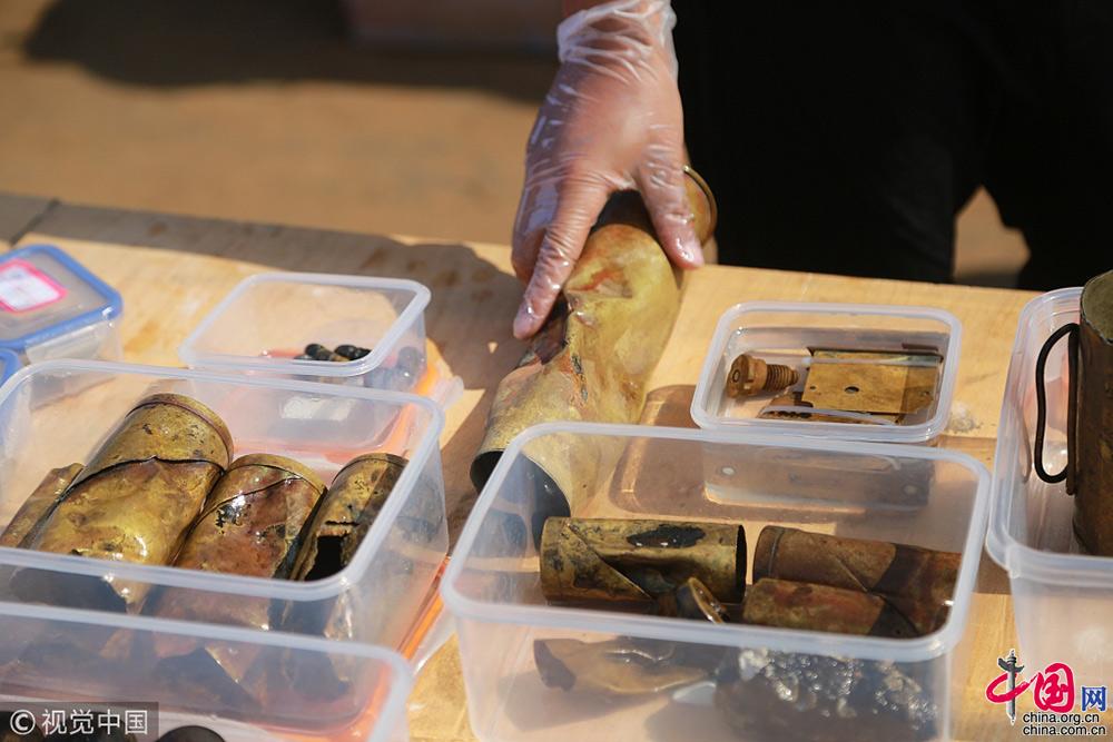 2018年9月25日,遼寧大連,在莊河黑島海域甲午戰(zhàn)爭(zhēng)“經(jīng)遠(yuǎn)艦”遺址出水的各類遺物標(biāo)本。視覺中國(guó)