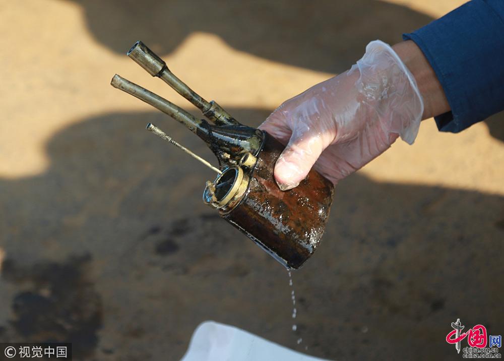 2018年9月25日,遼寧大連,在莊河黑島海域甲午戰(zhàn)爭(zhēng)“經(jīng)遠(yuǎn)艦”遺址出水的各類遺物標(biāo)本。視覺(jué)中國(guó)