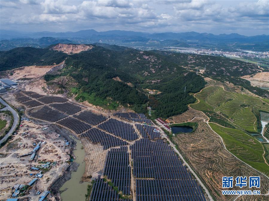 空中俯瞰湖州市埭溪鎮(zhèn)東紅村的光伏發(fā)電站(9月26日無人機拍攝)。該光伏電站占地2500多畝,是當(dāng)?shù)貜U棄礦坑通過改造建成的“農(nóng)光互補”光伏發(fā)電站。