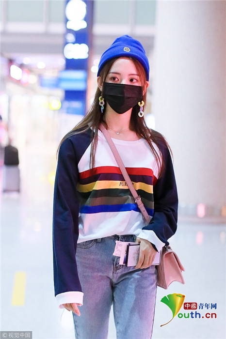 2018年9月25日,北京,“錦鯉少女”楊超越現(xiàn)身機場,她身穿“彩虹裝”青春無敵,戴著糖果色耳環(huán),細節(jié)處可愛吸睛。