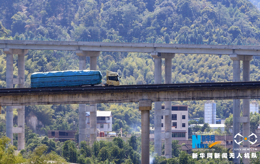 改擴(kuò)建工程最大限度減低了路面坡度。這兩處高架橋在廈蓉高速南靖縣和溪路段,前為一部貨車在長下坡路段爬坡,后為新建的路段。新華網(wǎng) 肖和勇 攝