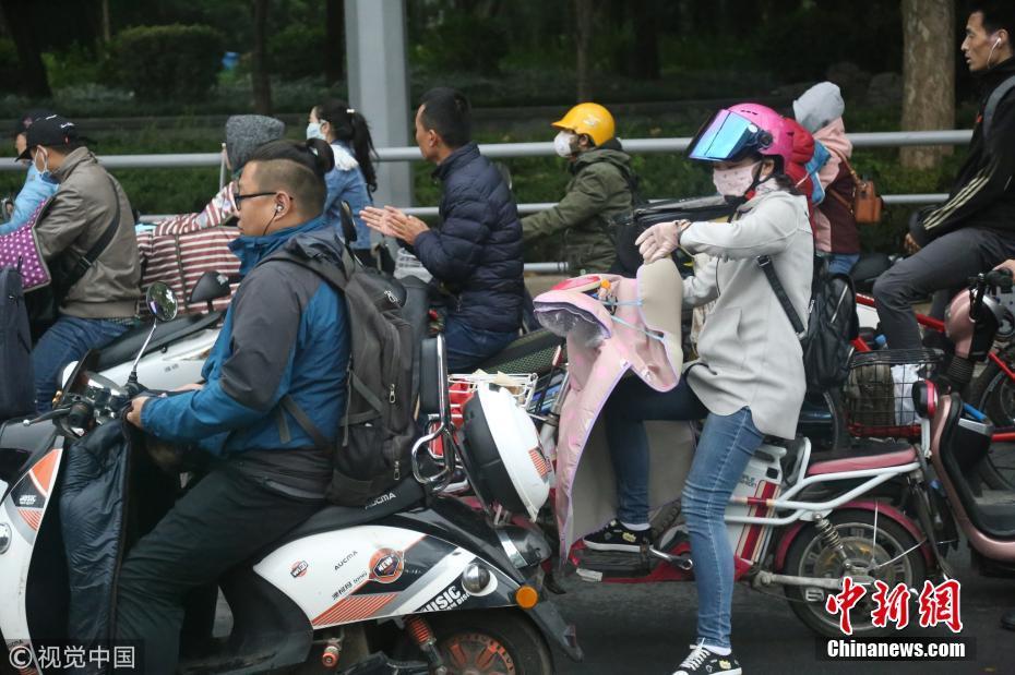 2018年10月9日,山東濟(jì)南,昨日一場(chǎng)秋雨過(guò)后開(kāi)始降溫,今天清晨最低氣溫只有6度,馬路上不少上班族穿上羽絨服騎車趕上班路。 圖片來(lái)源:視覺(jué)中國(guó)