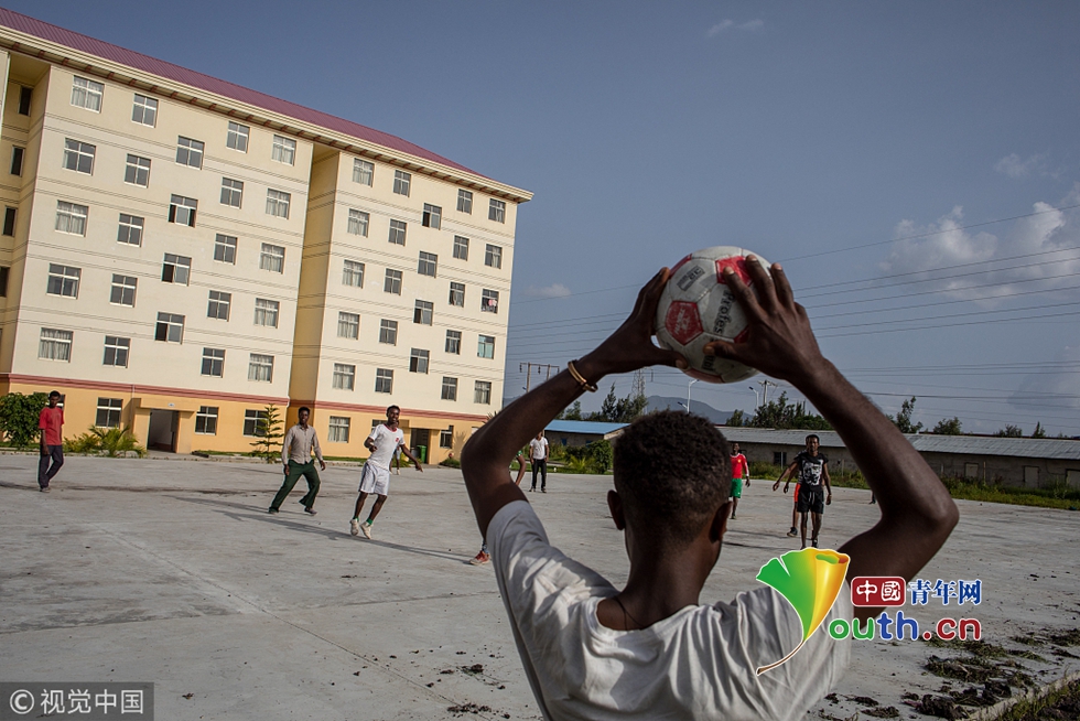 東方工業(yè)園宿舍區(qū),當(dāng)?shù)毓蛦T在工作結(jié)束后踢球。