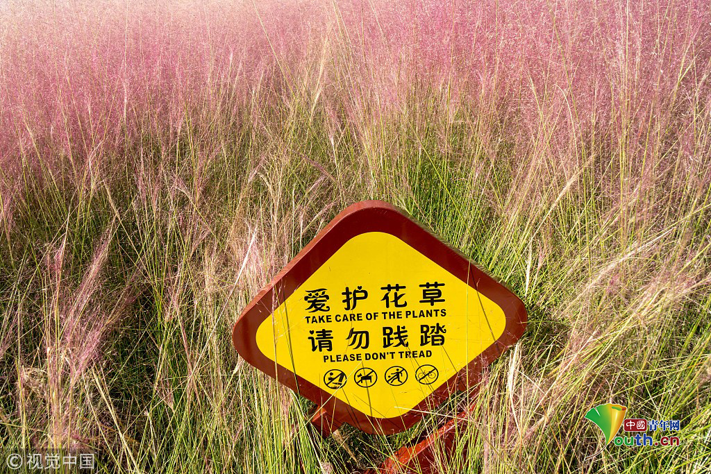 2018年9月28日,上海,東外灘楊浦濱江的粉黛亂子草目前已進入盛花期,當日早間,不少市民來到濱江拍照賞景,成片的紫色花海在藍天白云映襯下美不勝收。圖片作者:王岡/視覺中國