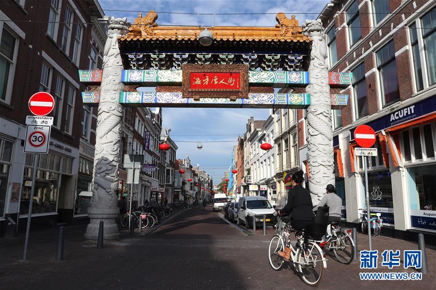 10月15日,在荷蘭海牙,人們騎車經(jīng)過唐人街的牌坊。 新華社記者鄭煥松 攝