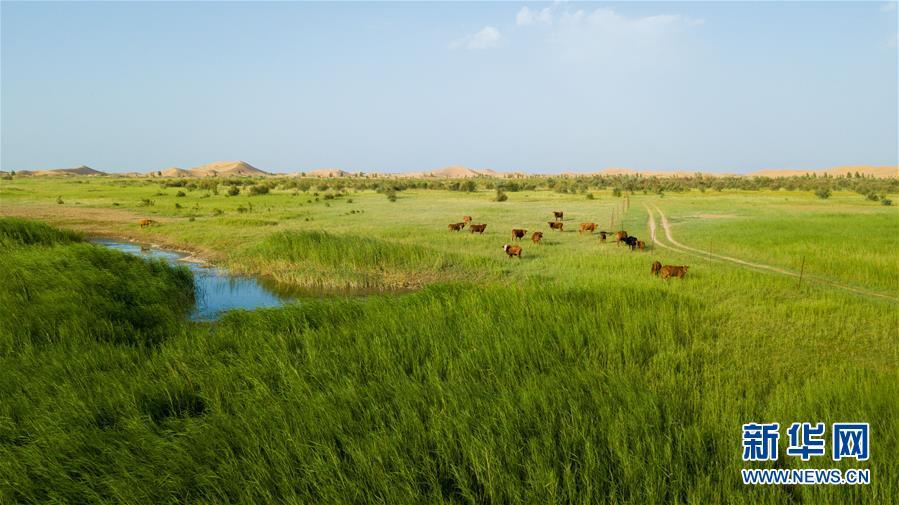 恩格貝月亮湖猶如鑲嵌在沙漠綠洲里的一塊碧玉。(新華網(wǎng) 王宇 攝)