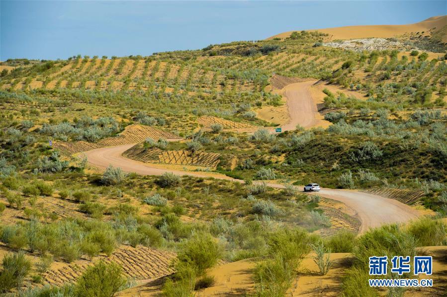 車(chē)輛在銀肯塔拉沙漠綠洲自然生態(tài)旅游區(qū)中穿行(6月7日攝)。