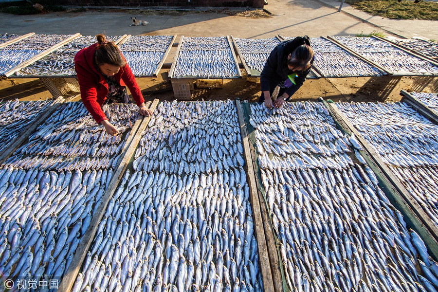 鄱陽湖畔漁民趁秋光晾魚蝦
