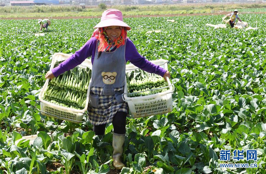 10月16日,硯山縣小補佐村的村民在種植基地收菜。 云南省文山壯族苗族自治州硯山縣稼依鎮(zhèn)小補佐村有55戶200多名壯族群眾曾經居住在大山深處。2017年10月,在政府的幫扶下,小補佐村易地扶貧建設新村,村民全部搬遷入住新居。 新華社記者 楊宗友 攝