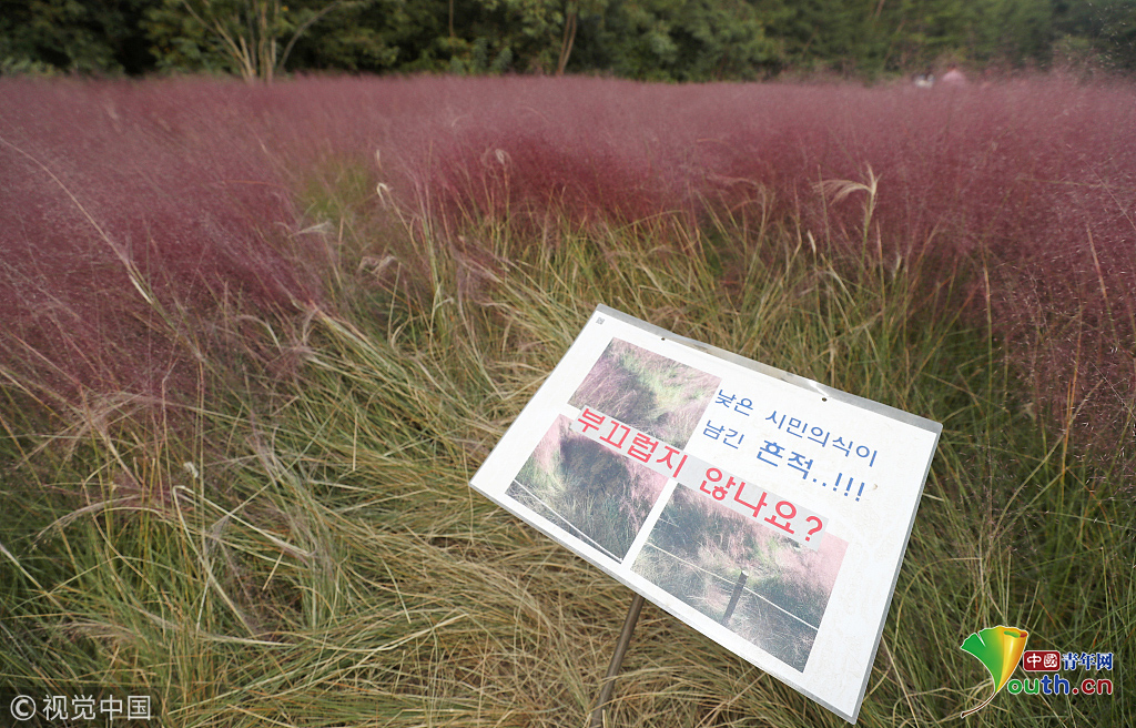 當?shù)貢r間2018年10月16日,韓國蔚山,近日,蔚山公園大片粉黛亂子草盛開,粉紅花海浪漫十足,但部分花海遭游客隨意踩踏。公園并沒有修復遭破壞區(qū)域,而是用繩索圍起并掛上批判性告示,呼吁游客腳下留情。圖片作者:Yonhap News Agency
