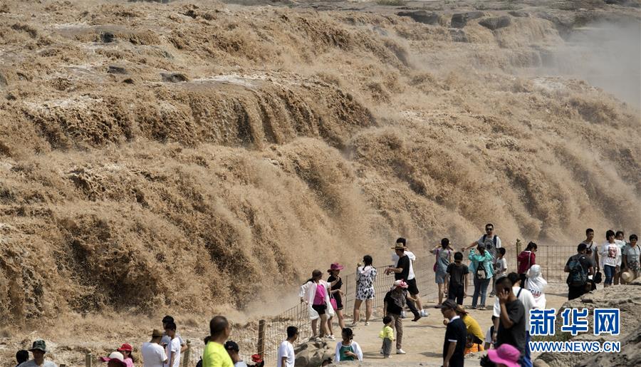 7月19日,游客在山西境內(nèi)的壺口瀑布群前留影。 新華社記者陶明 攝