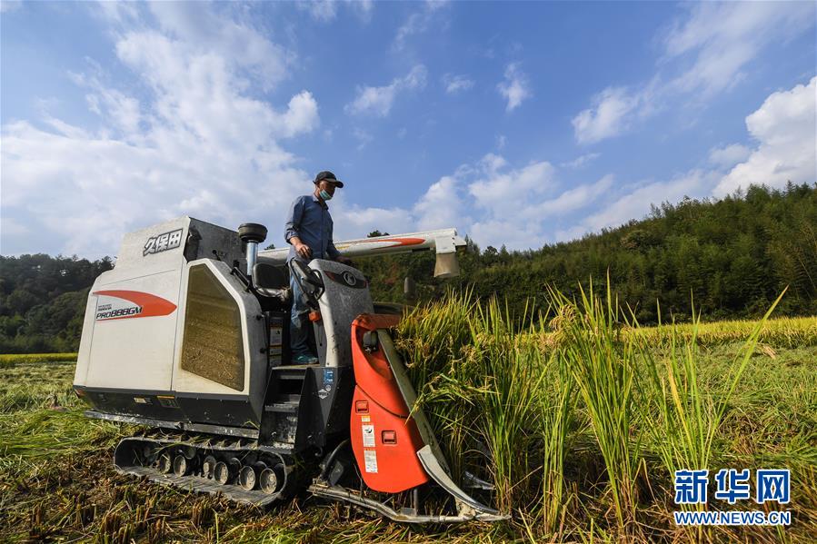 10月17日,工作人員操作收割機收割水稻。  新華社記者 徐昱 攝