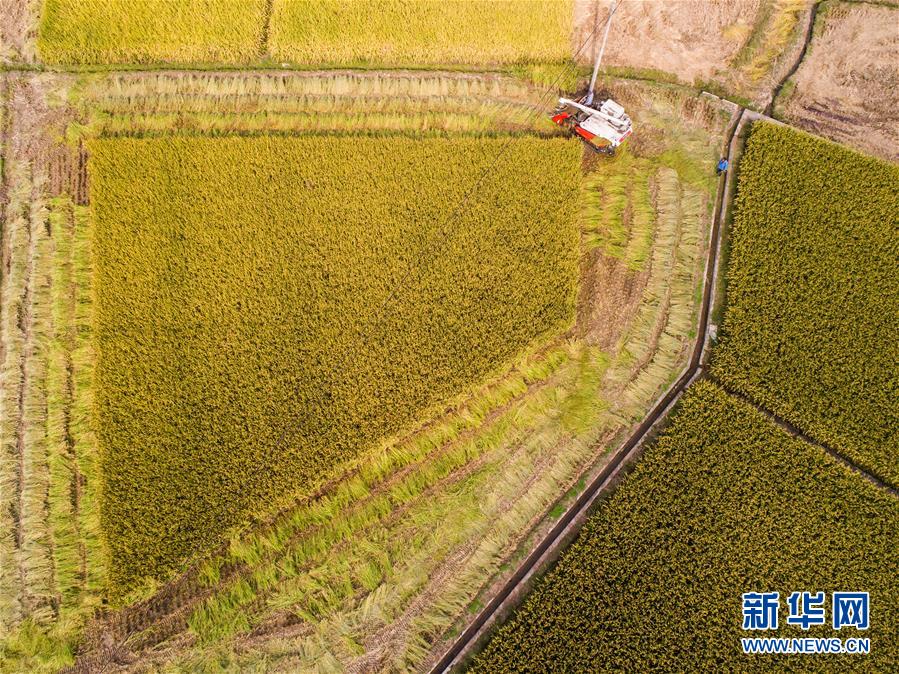 10月17日,工作人員操作收割機收割水稻(無人機拍攝)。  新華社記者 徐昱 攝