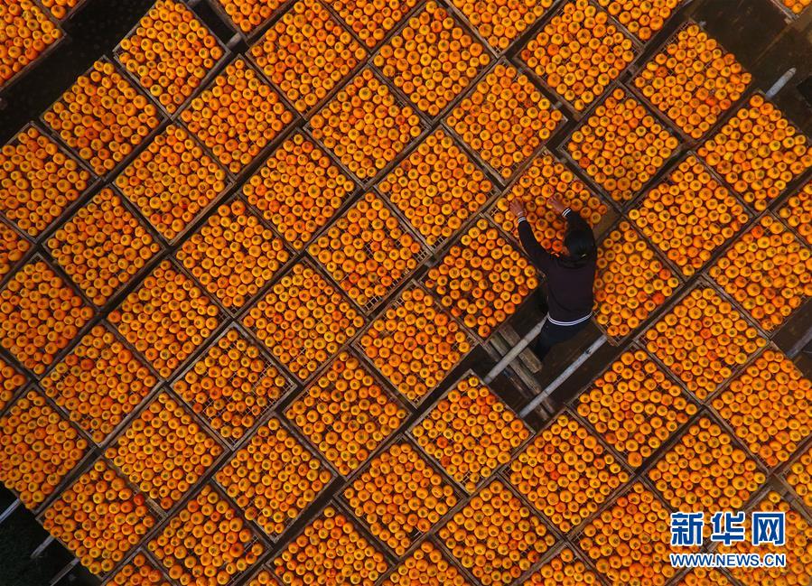10月17日,廣西桂林市平樂縣沙子鎮(zhèn)渡河村農(nóng)民在晾曬柿子(無人機(jī)拍攝)。 金秋時節(jié),農(nóng)民們忙著收獲成熟的農(nóng)作物,喜迎豐收。 新華社記者 黃孝邦 攝