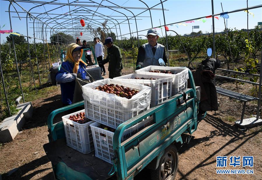 10月17日,在山東省青島市即墨區(qū)藍村鎮(zhèn)王演莊北村,種植戶在果園里收集采摘的大棗。 金秋時節(jié),農民們忙著收獲成熟的農作物,喜迎豐收。 新華社記者 李紫恒攝