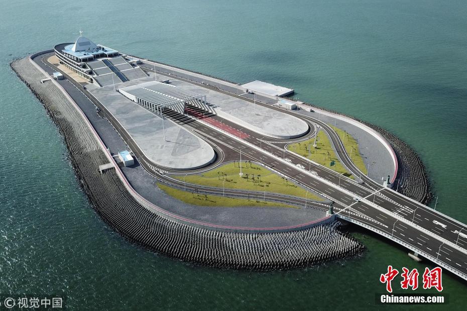 圖為2018年9月18日,強(qiáng)臺風(fēng)“山竹”吹襲香港過后,港珠澳大橋安然無恙。圖為位于香港海域的港珠澳大橋東人工島。李志華 攝 圖片來源:視覺中國