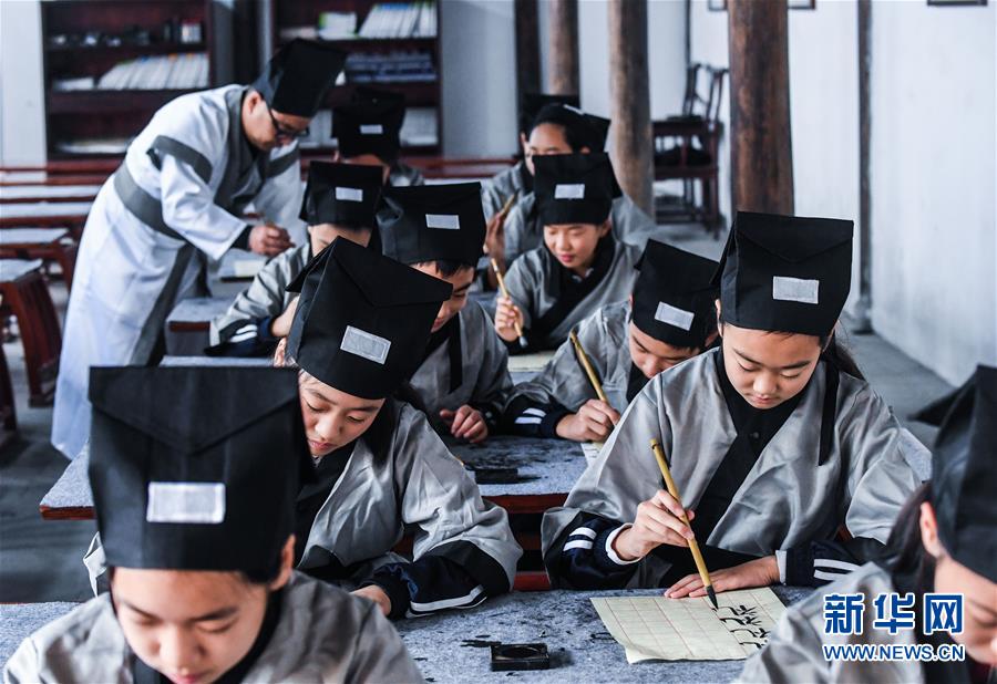 10月23日,學(xué)生們在參加“誠敬日”傳統(tǒng)書法學(xué)習(xí)。當(dāng)日,浙江省長興縣第八小學(xué)舉行“誦家規(guī)家訓(xùn),傳中華美德”校園“誠敬日”主題教育活動,通過誦讀國學(xué)經(jīng)典、講勵志故事、演美德戲劇等形式,讓學(xué)生感受優(yōu)秀傳統(tǒng)文化。近年來,該學(xué)校立足“誠敬”文化,注重國學(xué)啟蒙教育,讓學(xué)生從小培養(yǎng)“以誠立身、以敬處事”的良好品質(zhì)。新華社記者 徐昱 攝