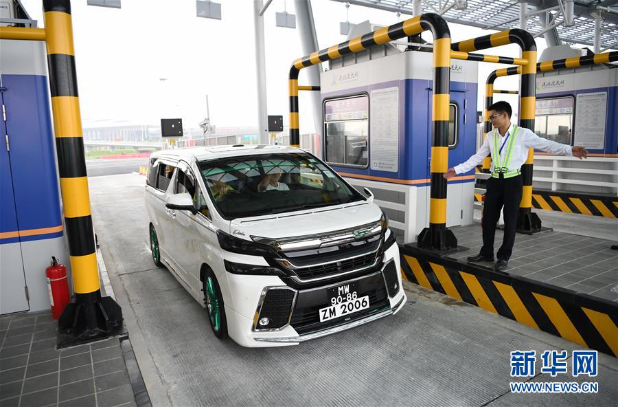 10月24日,首輛從珠海開往香港的私家車輛通過港珠澳大橋收費站。當(dāng)日,港珠澳大橋正式通車。 新華社記者梁旭攝