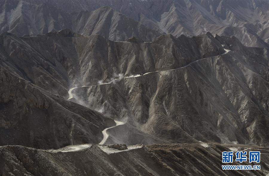 在距離且末縣縣城160多公里的昆侖山上的興發(fā)達(dá)玉礦,可見對(duì)面山上運(yùn)載銅鋅礦礦石的卡車行駛在簡(jiǎn)易礦山公路上(10月23日攝)。 新華社記者武巍攝