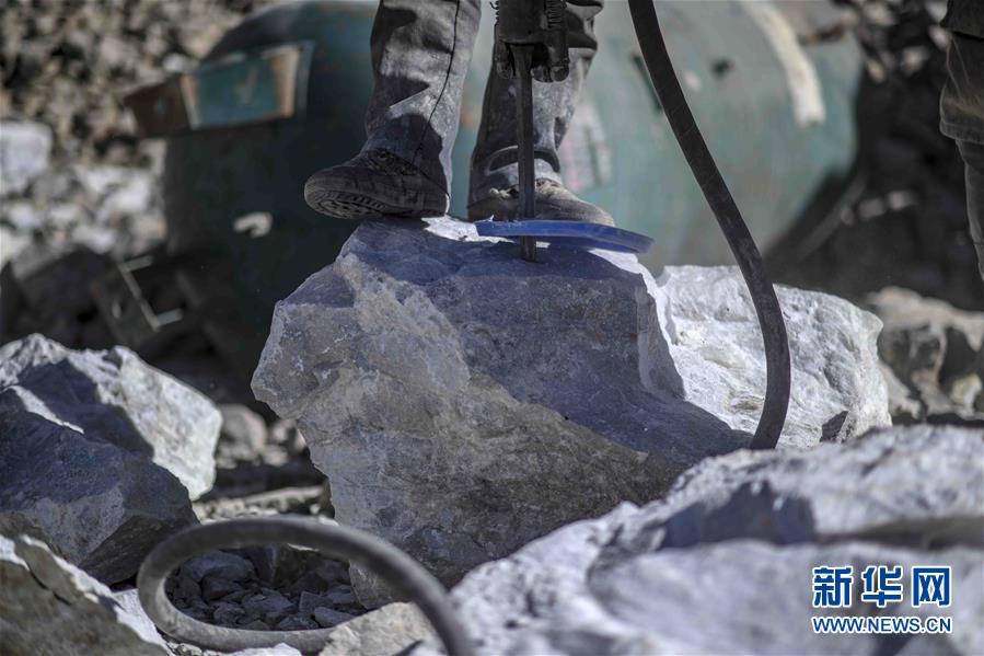 在興發(fā)達(dá)玉礦,采玉師傅們正往玉石上打眼,便于觀察玉石品質(zhì)(10月23日攝)。 新華社記者趙戈攝