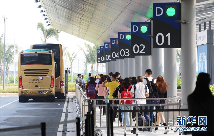 10月24日,跨境巴士在澳門口岸離境車道上通關(guān)。當日9時,港珠澳大橋正式通車。 新華社記者張金加攝