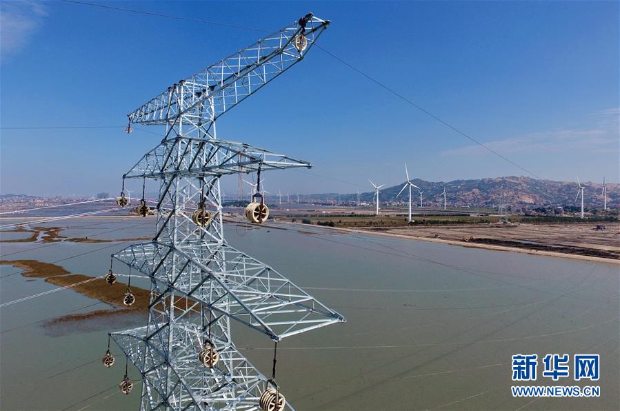 這是建在莆田平海灣上開始架線的輸送風(fēng)電鐵塔和遠(yuǎn)處的東嶠風(fēng)力發(fā)電場(chǎng)(10月25日無人機(jī)拍攝)。 新華社記者林善傳攝