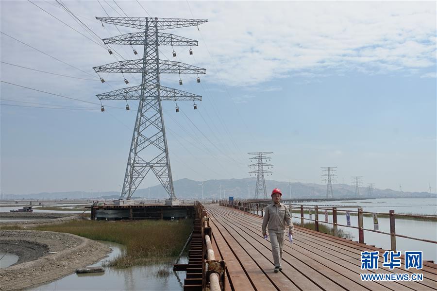 10月25日,施工人員從莆田埭頭風電220千伏送出工程橫跨平海灣的全路徑棧橋上通過。 新華社記者林善傳攝