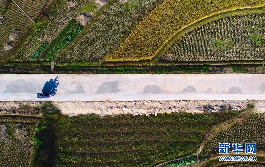 10月30日,曾紀連載著電影放映設備穿過稻田,準備為村民們放映電影(無人機拍攝)。新華社記者 胡晨歡攝