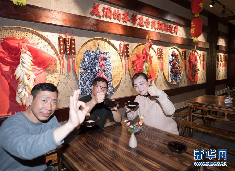 游客在浙江省建德市大同鎮(zhèn)管村橋村文化禮堂品嘗該村特產(chǎn)土酒(2018年3月13日)。2017年起,建德市對農(nóng)村文化禮堂建設(shè)進(jìn)行“一村一品”提升改造,打造惠民、育德、展示等為一體的文化禮堂,嘗試“鄉(xiāng)村文創(chuàng)客廳”建設(shè),促進(jìn)鄉(xiāng)村振興。新華社記者 翁忻旸 攝
