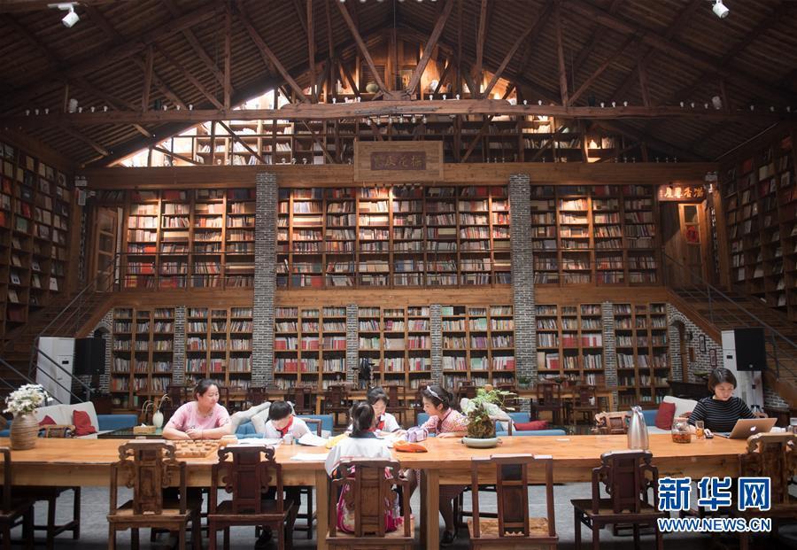 浙江省德清縣莫干山鎮(zhèn)廟前村小學(xué)生在“莫干山居圖”民宿里讀書(2018年5月29日攝)。2012年,在杭州從事出版業(yè)的朱錦東,想要回到從小生活的鄉(xiāng)村,他租下莫干山鎮(zhèn)廟前村廢舊閑置的禮堂,將其改造成為一家書香四溢的民宿,起名為“莫干山居圖”。他將琴棋書畫引入居住空間,民宿在2015年開業(yè)后迅速打響了名氣,目前年接待住客7000人次。新華社記者 翁忻旸 攝