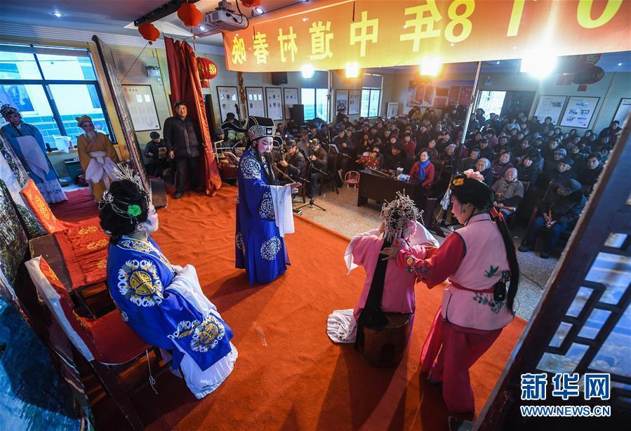 2018年2月6日,長興風(fēng)華藝術(shù)團(tuán)的演員們?yōu)楹闃蜴?zhèn)中道村的村民們演出越劇。據(jù)了解,長興縣每年都會安排100多場“送戲下鄉(xiāng)”活動,滿足村民的精神文化需求。新華社記者 徐昱 攝