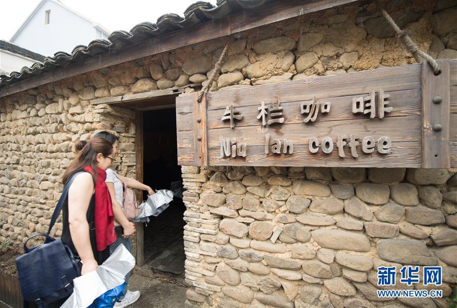 游客走進(jìn)浙江省桐廬縣江南鎮(zhèn)荻浦村由牛欄改建的咖啡館(2018年4月23日攝)。新華社記者 翁忻旸 攝
