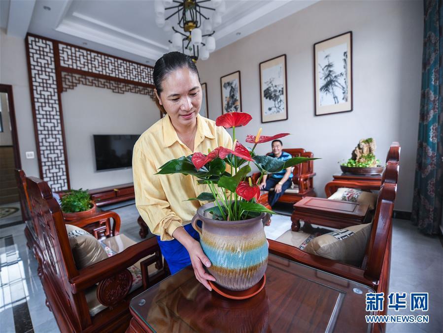 2018年9月26日,東林鎮(zhèn)東升村村民施勤英在新居內(nèi)布置綠色盆栽植物。新華社記者 徐昱 攝
