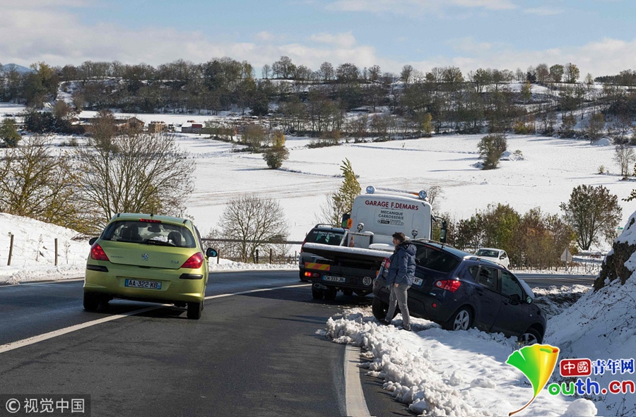 當?shù)貢r間2018年10月30日,法國菲克斯圣熱內,當?shù)赝唤荡笱?,導?50人被困在大雪覆蓋的公路上,不得不睡在緊急救援中心。法國國家氣象局已經將當?shù)刂糜诔壬踩渲隆?/p>