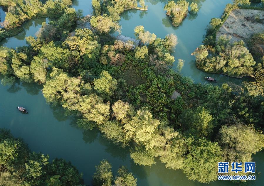 10月29日,游船行駛在西溪濕地河道上(無(wú)人機(jī)拍攝)。 新華社記者翁忻旸攝