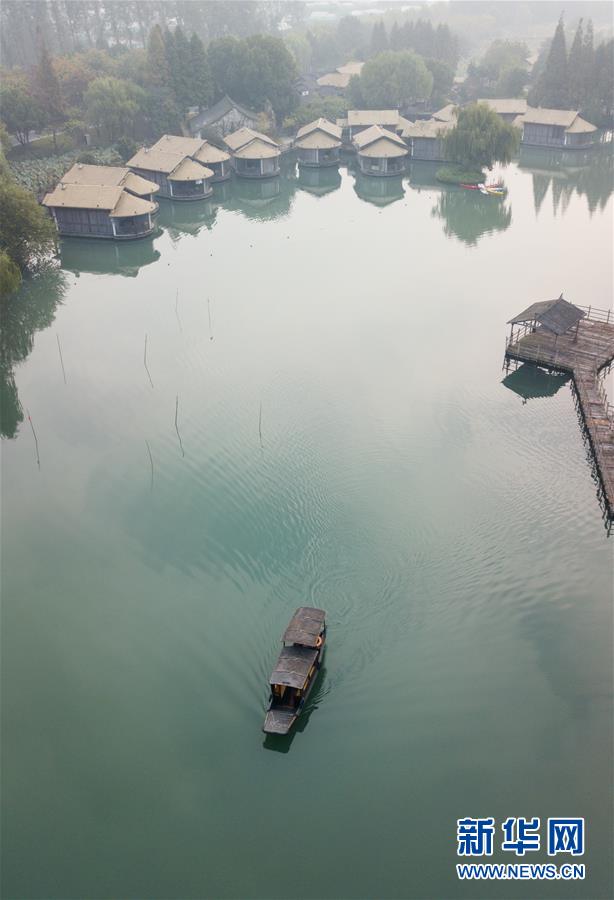 10月18日,一艘游船行駛在烏鎮(zhèn)水道上(無人機拍攝)。新華社記者翁忻旸攝