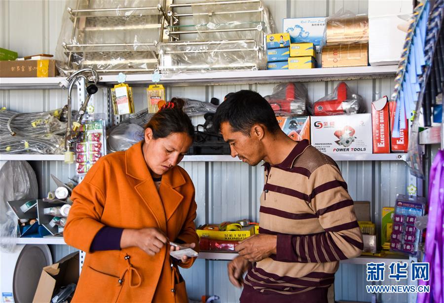 在位于澤普縣桐安鄉(xiāng)的建材鋪里,熱娜古麗·喀爾曼(左)跟前來購買建材的顧客交談(10月28日攝)。  新華社記者 關(guān)俏俏 攝