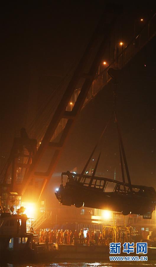 2018年10月31日消息,重慶。10月31日23時28分,重慶萬州長江二橋墜江公交車被打撈出水。