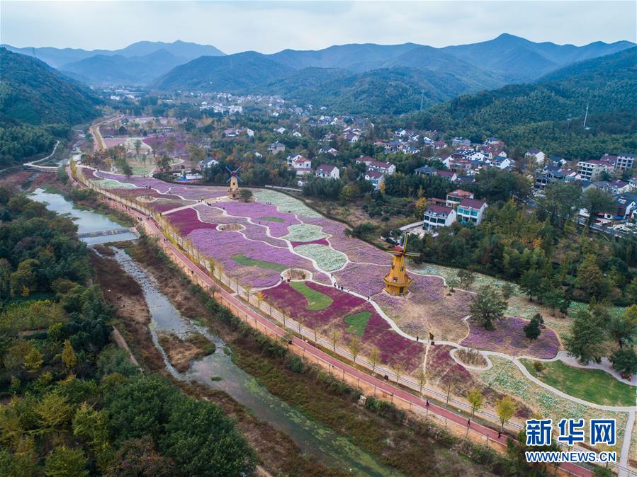 11月2日,空中俯瞰小浦鎮(zhèn)的“五彩花海”,多彩的花海與金黃的銀杏林構(gòu)成了一幅美麗的秋季風景(無人機拍攝)。 新華社記者 徐昱 攝