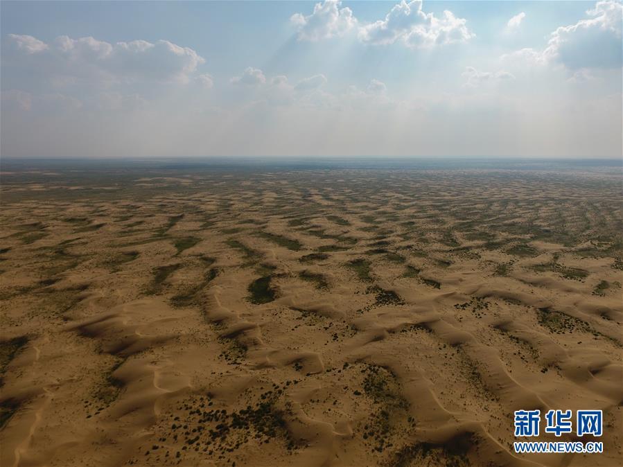 庫布其沙漠深處,植被與沙漠形成美麗的紋理(7月31日無人機拍攝)。新華社記者劉磊攝