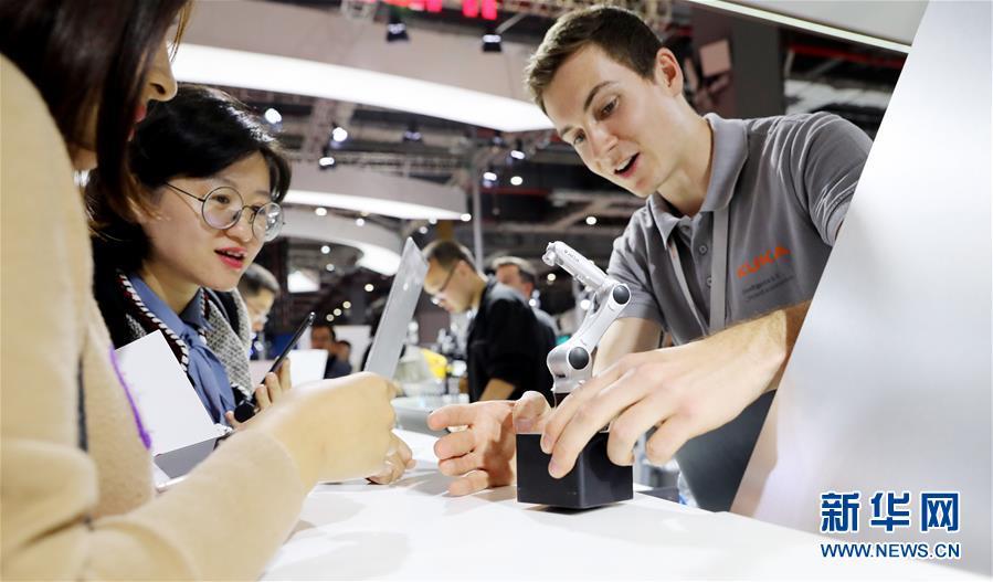 11月5日,庫卡公司工作人員(右)向參觀者展示機(jī)器人手臂模型。 新華社記者 方喆 攝