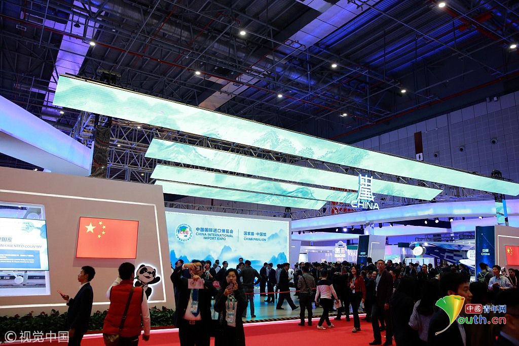 2018年11月6日,上海,首屆中國國際進(jìn)口博覽會(huì)國家展上,共有82個(gè)國家、3個(gè)國際組織設(shè)立了71個(gè)展臺(tái)。中國館。視覺中國
