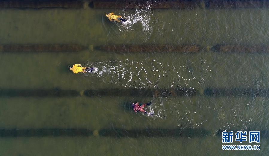 10月22日,樂亭縣姜各莊鎮(zhèn)二節(jié)村海參養(yǎng)殖基地的工人在捕撈海參(無人機拍攝)。 時下,正值渤海灣地區(qū)海參收獲時節(jié),河北省樂亭縣的海參養(yǎng)殖戶忙著捕撈海參,供應各地市場。據(jù)介紹,該縣海域水質優(yōu)良、氣候適宜,是海參養(yǎng)殖的理想場地,目前發(fā)展池塘造礁養(yǎng)殖海參面積6萬畝,年產(chǎn)鮮活海參6000多噸,年產(chǎn)值2億多元。 新華社記者 楊世堯 攝