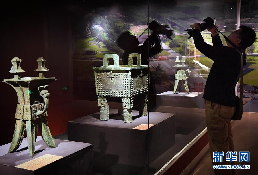 10月12日,參觀者在安陽博物館拍攝展品。目前,“鳳歸大邑商——殷墟婦好文物安陽故里展”正在安陽博物館展出,共展出文物474件。1976年被考古學(xué)家發(fā)現(xiàn)的婦好墓,是世界文化遺產(chǎn)、中國商代后期都城遺址——殷墟唯一保存完整的商代王室墓葬。新華社記者李安攝