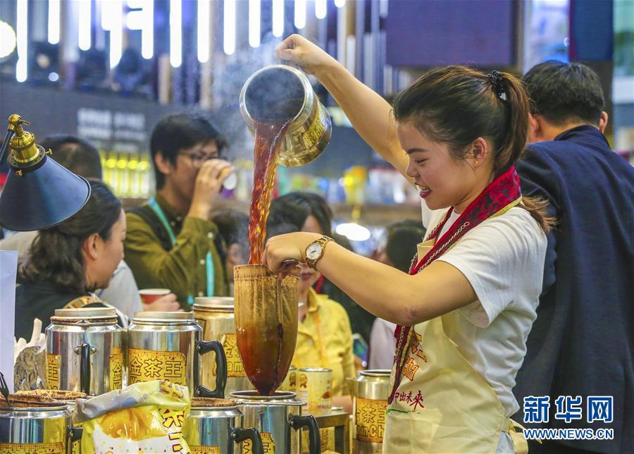 11月7日,在進博會食品及農(nóng)產(chǎn)品展區(qū),參展人員制作“金茶王”港式奶茶。 新華社記者 殷剛 攝