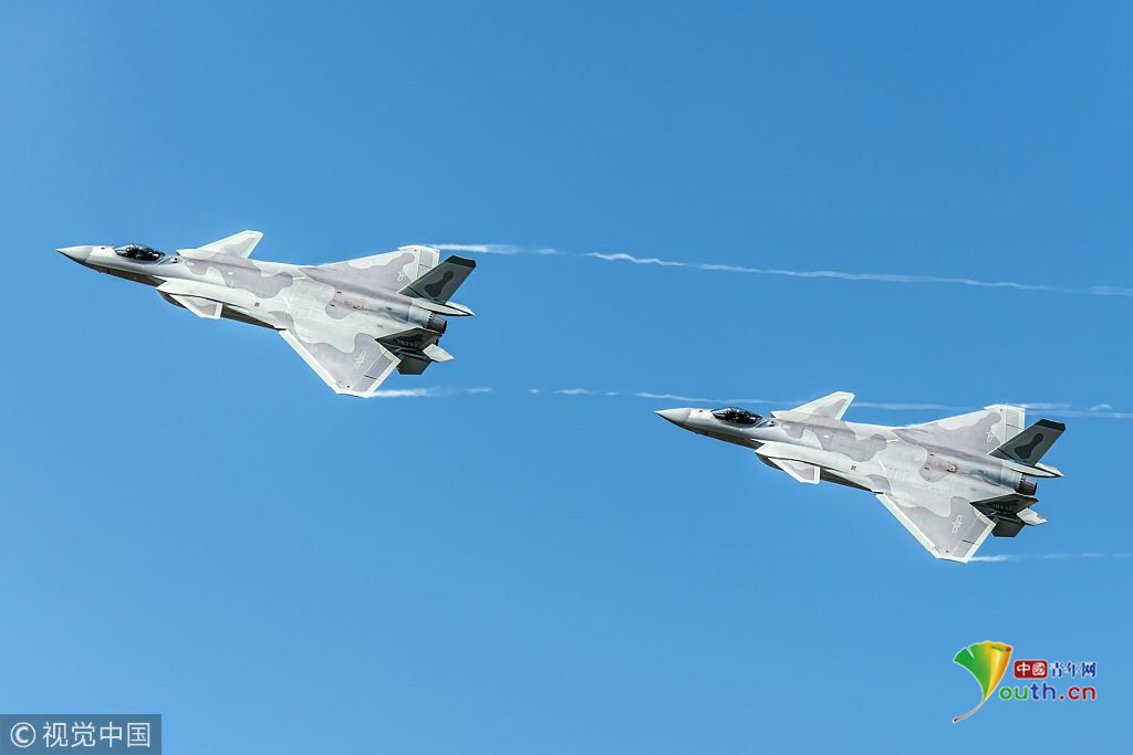 圖二:2018年11月6日,廣東珠海航展上,兩架殲-20戰(zhàn)機組成雙機編隊進行飛行表演。